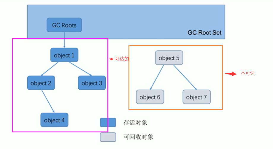 - 在可达性分析算法中,只有能够被根对象集合直接或者间接连接的对象才是存活对象。