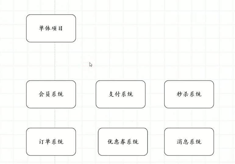将原来的单体架构的项目进行模块化的拆分,即使某个模块宕机也不会使项目下线。降低了模块之间的耦合度。比如将一个商城系统进行拆分: