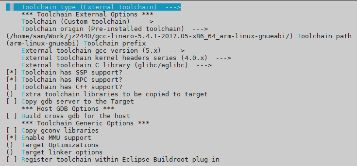 $ make ARCH=arm menuconfig我暂时只做配置了以下这些: