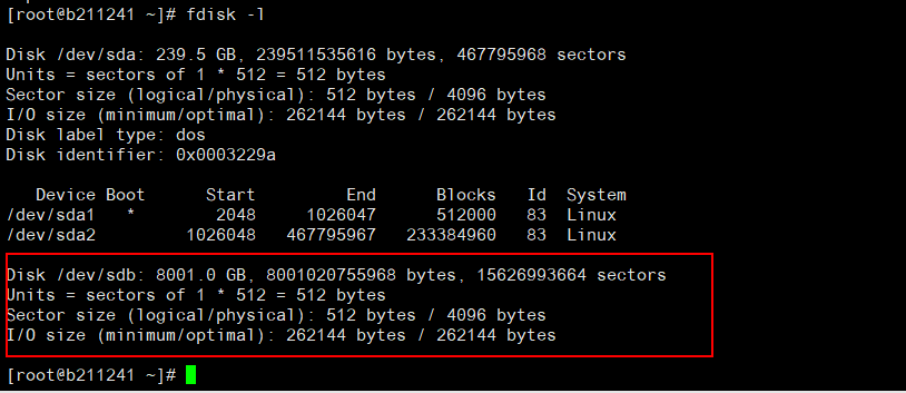 三,磁盘挂载,这里先暂时省略磁盘的挂载,直接跳到如何设置磁盘挂载开机自动挂载。在磁盘挂载好后,如果我们重启,磁盘挂载就会失效,每次都要去执行挂载很麻烦,而且如果不知道挂载命令,还会出现挂载不上的情况,所以做磁盘开机自动挂载很有必要。首先 fdisk -l 查看你所挂载的磁盘名称,我这里是/dev/sdb