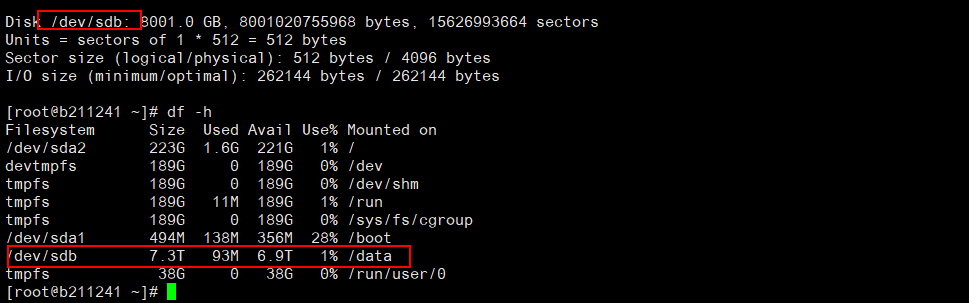 可以看到我这里将/dev/sdb 磁盘挂载到了 /data目录,上面的步骤都是为了获取挂载的信息,下面的步骤是设置开机挂载。
