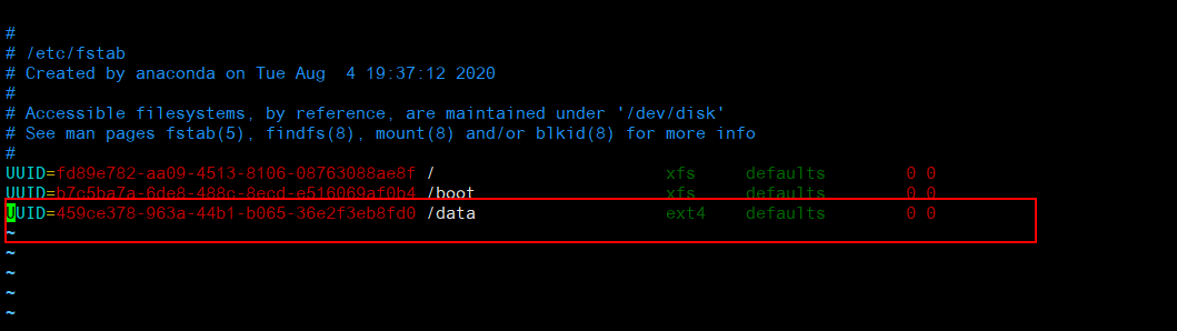 增加自动挂载磁盘信息, 修改(vim /etc/fstab)配置文件: