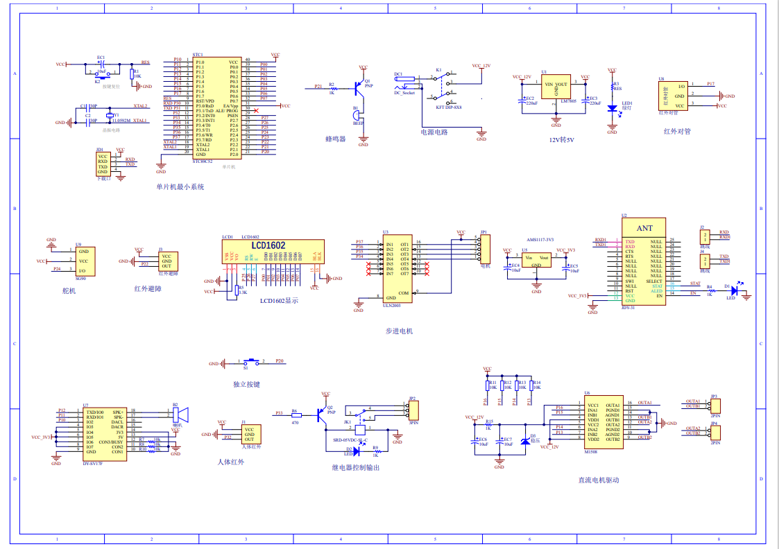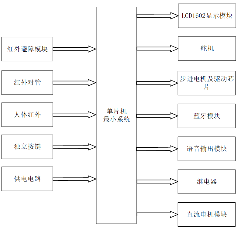 本设计以STC89C52单片机为核心控制器,加上其他的模块一起组成基于51单片机的智能垃圾桶的整个系统,其中包含中控部分、输入部分和输出部分。中控部分采用了STC89C52单片机,其主要作用是获取输入部分数据,经过内部处理,控制输出部分。输入由四部分组成,第一部分是红外避障模块,通过该模块可检测到是否有障碍物;第二部分是红外对管模块,通过该模块可检测垃圾桶是否已满;第三部分是人体红外,通过人体红外可检测是否有人;第四部分是独立按键,通过一个独立按键控制垃圾桶的开和关;第五部分是供电电路,给整个系统进行供电。输出由六部分组成,第一部分是LCD1602显示模块, 通过该模块可以显示垃圾桶的状态等;第二部分是舵机模块,通过该模块控制红外避障的转向;第三部分是步进电机及驱动模块,通过该模块控制垃圾桶的开关盖;第四部分是JDY-31蓝牙模块,通过该模块可以连接手机;第五部分是语音输出模块,当垃圾桶满时,语音播报“垃圾桶已满”。第六部分是继电器,通过该模块定时给垃圾桶消毒;第七部分是MX1508直流电机模块,通过该模块使车轮转动。