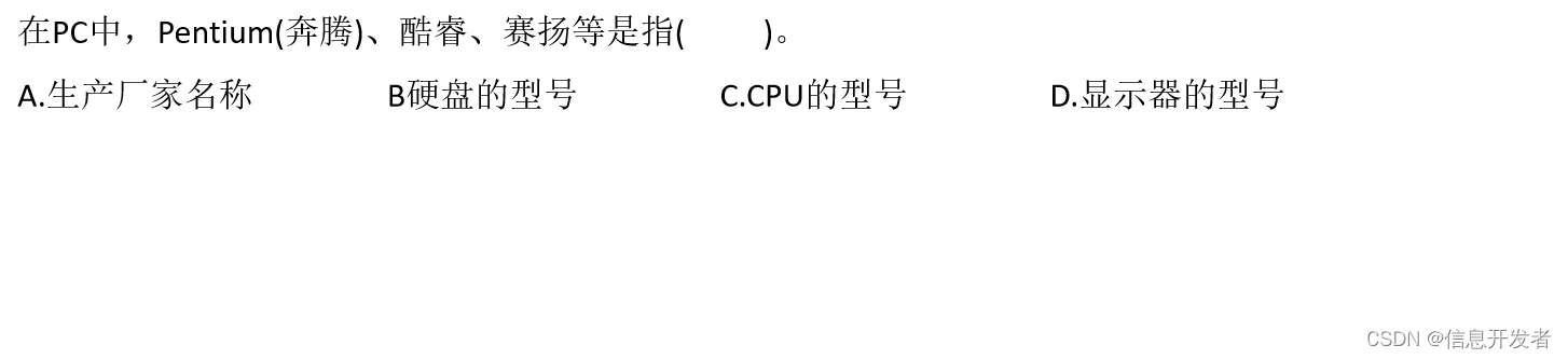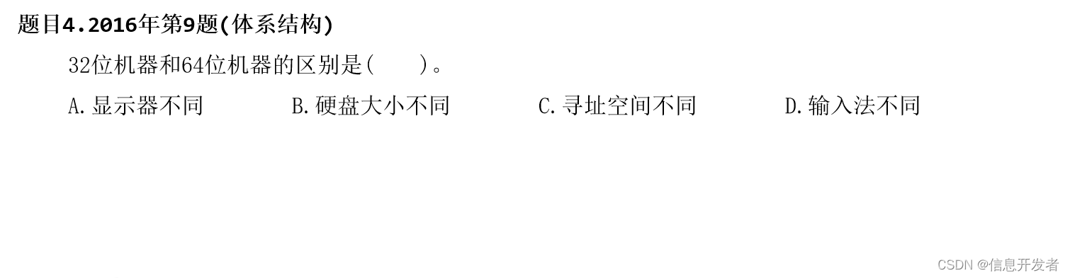 我们先来看今天的第一道题,可以看到,第一题是32位机器和64位机器的区别是什么?首先排除掉A,因为显示器是你自己买的,不同与否是看你买的是否相同,所以手先排除A,再看B,B肯定也不对,为啥呢?因为硬盘大小不同也是取决与你是否买的大小不同,所以也并不是B,再看D,可以看到D也不对,为什么呢?因为输入法取决于你下载的是哪个输入法,你下载的不同使用的就不同,所以这道题利用排除法,答案应该是C,那么为什么是C呢?因为寻址空间一般指的是CPU对于内存寻址的能力,这种寻址能力是由机器的位数决定的。显示器的屏幕尺寸是指屏幕对角线的长度,单位为英寸。硬盘容量是以MB(兆)和GB(千兆)为单位的,影响硬盘容量的因素有单碟容量和碟片数量。输入法是指将各种符号输入计算机或其他设备而采用的编码方法。