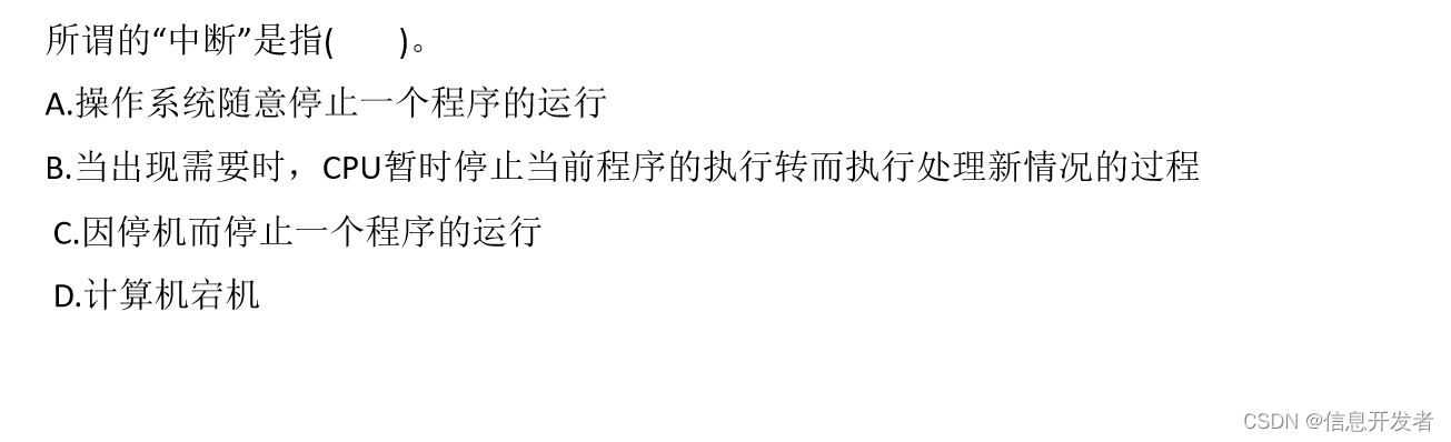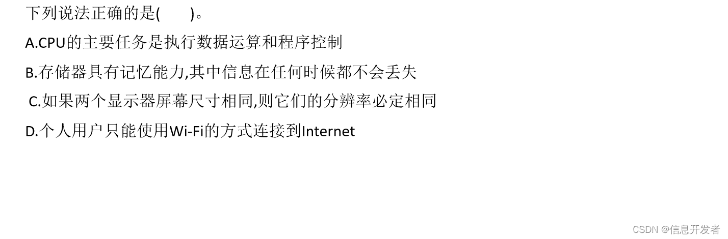 我们来看这道题,首先排除B,信息任何时候都不会丢失说的有一点点的太确定了,凡事都有以外的时候,万一你的电脑不小心中了病毒呢?所以B肯定是错的, 再看C,C肯定也是错的,为什么呢?因为显示屏的大小并没有办法决定你的分辨率,只能稍微大一些,所以C也是错的。所以这道题的答案因该是A,因为CPU的任务本来就是执行数据的运算和对程序的控制,所以答案应该是A。