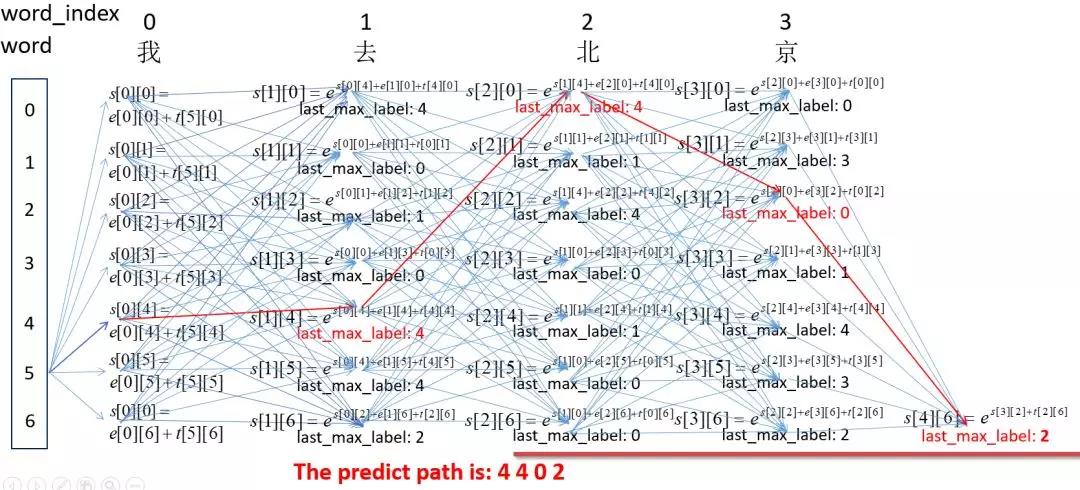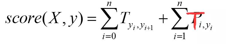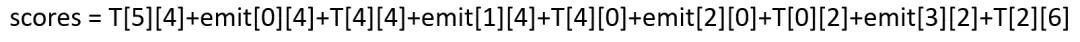 此时我们得出此时的word_index=1到label_index=4的分数为emit[1][4]+T[4][4]。但是,CRF为了全局考虑,将前一个的分数也累加到当前分数上,这样更能表达出已经预测的序列的整体分数,最终的得分score为: