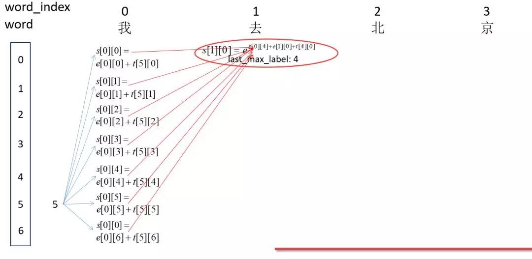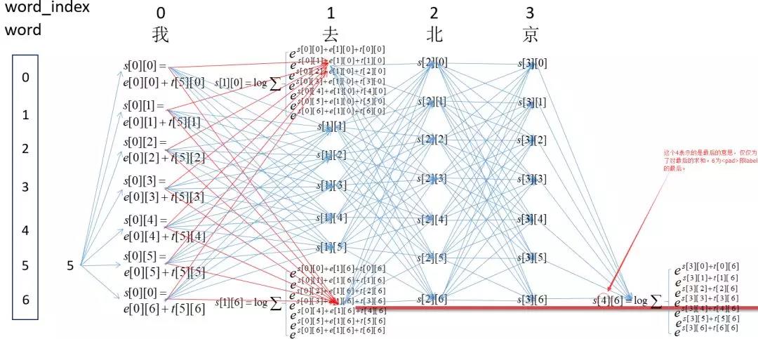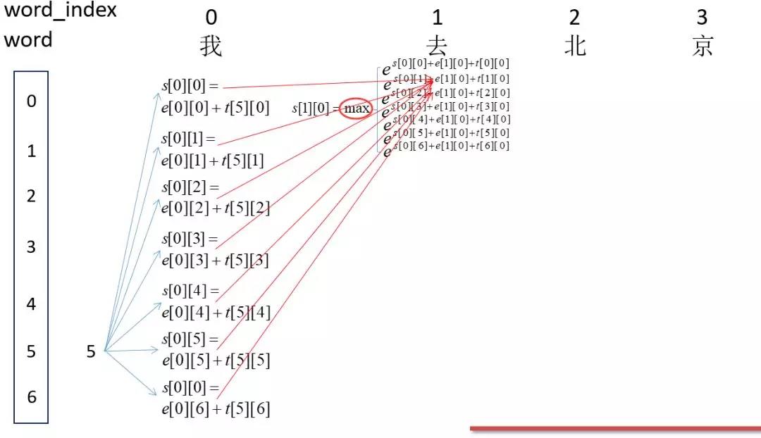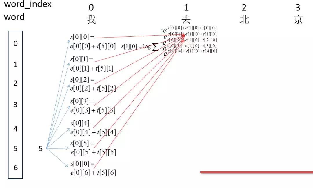 因为刚开始为<start>即为5,然后word_index为0的时候的所有可能的得分,即s[0][0],s[0][1]...s[0][6]中间的那部分。然后计算word_index为1的所有s[1][0],s[1][1]...s[1][6]的得分,这里以s[1][0]为例,即红箭头的焦点处:这里表示所有路径到这里的得分总和。