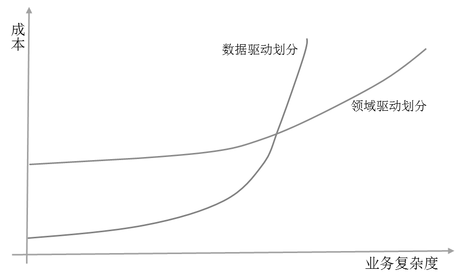 根据业务复杂度划分服务,如图2-4所示。当业务复杂度足够高的时候,应该基于领域驱动划分服务,而领域驱动本身足够复杂,很多概念比较抽象,应用范围并不是特别广泛,所以当业务复杂度较低时,可以选择基于数据驱动模式划分服务,数据驱动模式更容易理解和上手,也就是说,除非业务复杂度非常高,否则应该优先以数据驱动模式划分服务。这里的业务复杂度专指业务逻辑,而非数据量、并发量等相关复杂度。