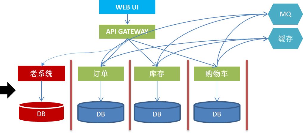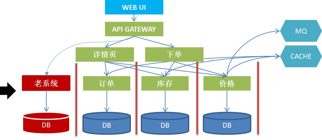 第三步,不断地从老系统抽象服务,垂直划分优先,如图2-7所示。