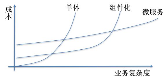 单体、组件化、微服务架构成本趋势,如图2-1所示。当业务复杂度达到一定程度后,微服务架构消耗的成本才会体现优势,并不是所有的场景都适合采用微服务架构,服务的划分应逐步进行,持续演进。产品初期,业务复杂度不高的时候,应该尽量采用单体架构。