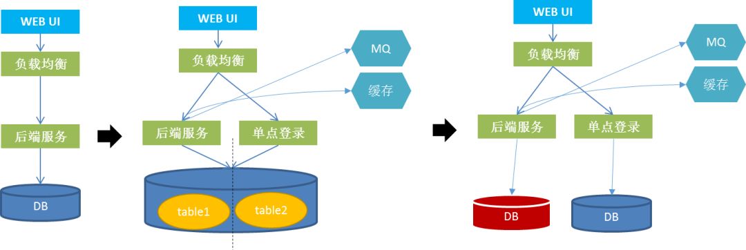 第二步,提取公共基础服务,如单点登录,拆分可以遵循逻辑分离和物理分离两种方法。另外随着系统压力的增加,可能会用到消息中间件、分布式缓存等服务。
