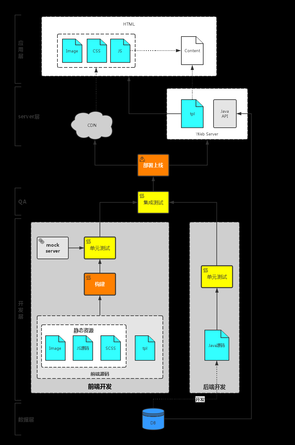 上图是一个比较成熟的前后端协作体系。当然,目前由于Node.js的流行开始普及大前端的概念,稍后会讲述。