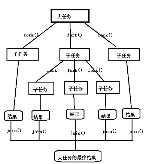 把一个大任务调用 fork()方法分解为若干小的任务,把小任务的处 理结果进行 join()合并为大任务的结果