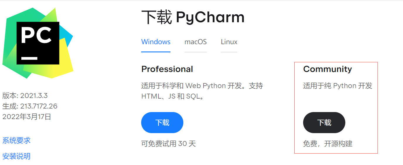 PyCharm分商业版和社区版,商业版功能丰富,收费;社区办功能阉割一些,基本够用,免费。