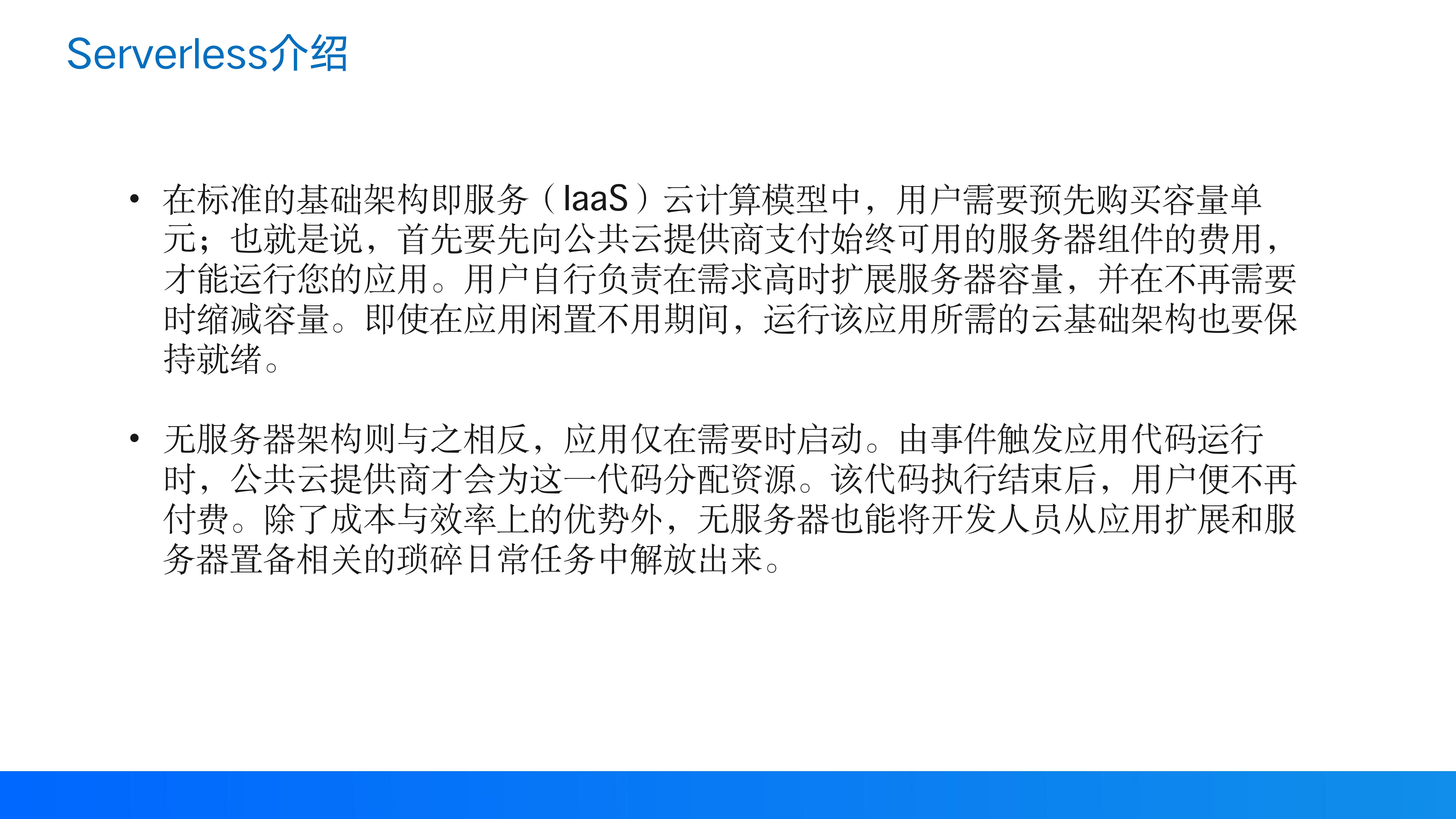 - 字面理解即无服务架构,指由第三方云计算供应商以服务的方式为开发者提供所需功能,例如数据库、消息,以及身份验证等。它的核心思想是让开发者专注构建和运行应用,而无需管理服务器。