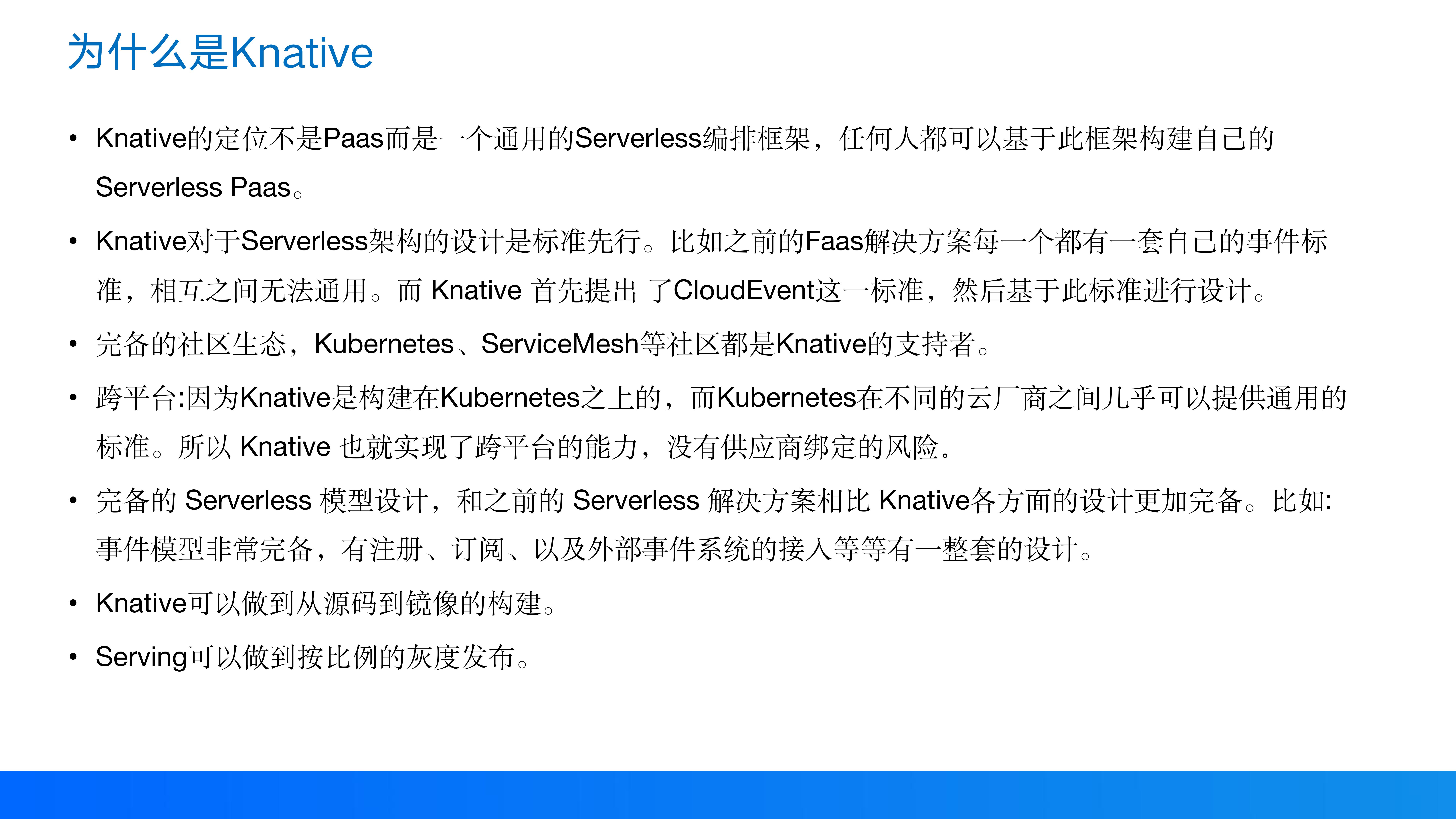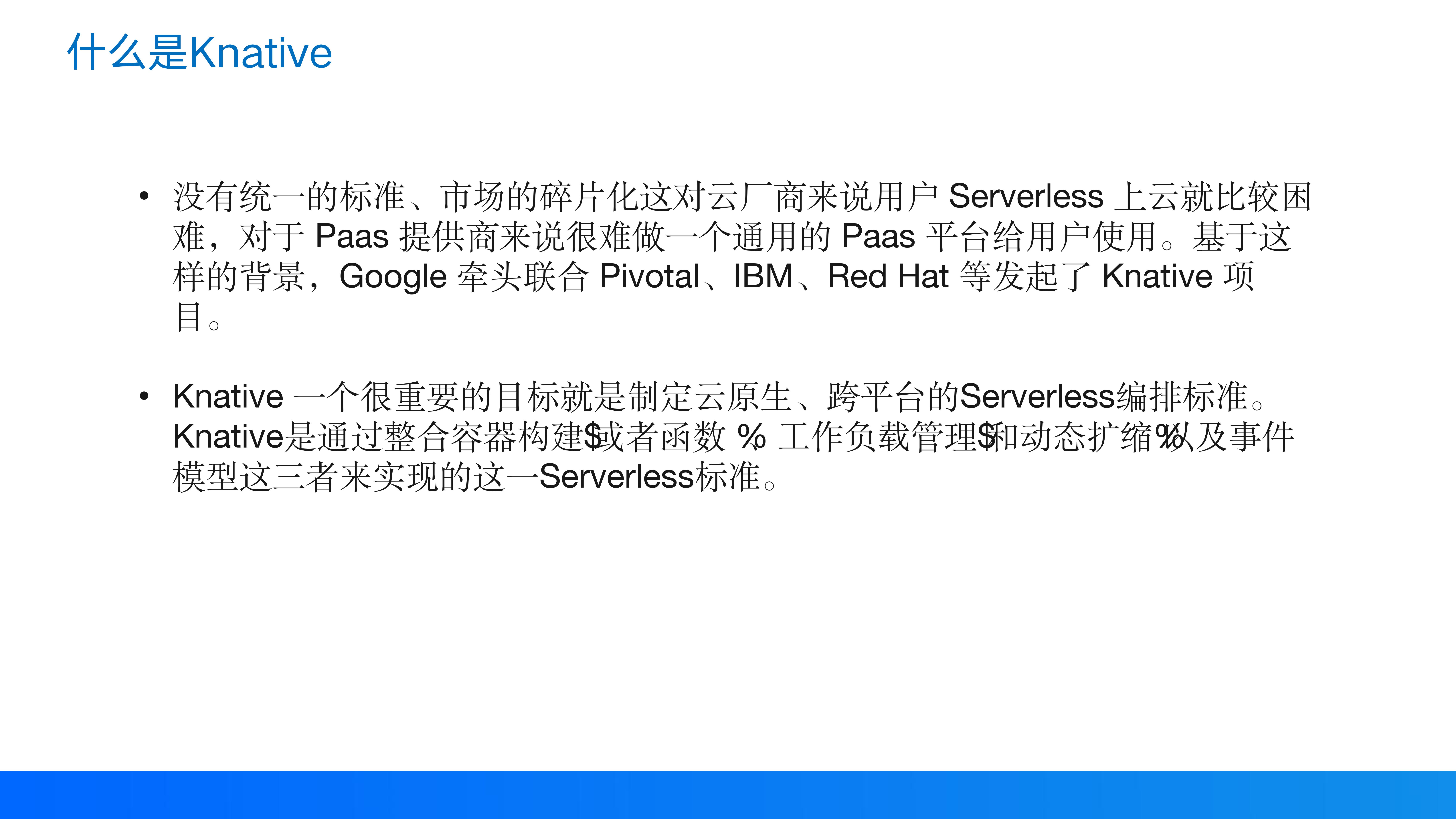- 业务代码部署到 Serverless 平台上就离不开源码的编译、部署和事件的管理。 然而无论是开源的解决方案还是各公有云的 FAAS 产品大家的实现方式大家都各不相同,缺乏统一的标准导致市场呈现碎片化。因此无论选择哪一个方案都面临供应商绑定的风险。这对云厂商来说用户 Serverless 上云就比较困难,对于 PAAS 提供商来说很难做一个通用的 PAAS 平台给用户使用。基于这样的背景 Google 牵头联合 IBM、Red Hat 等发起了 Knative 项目。
