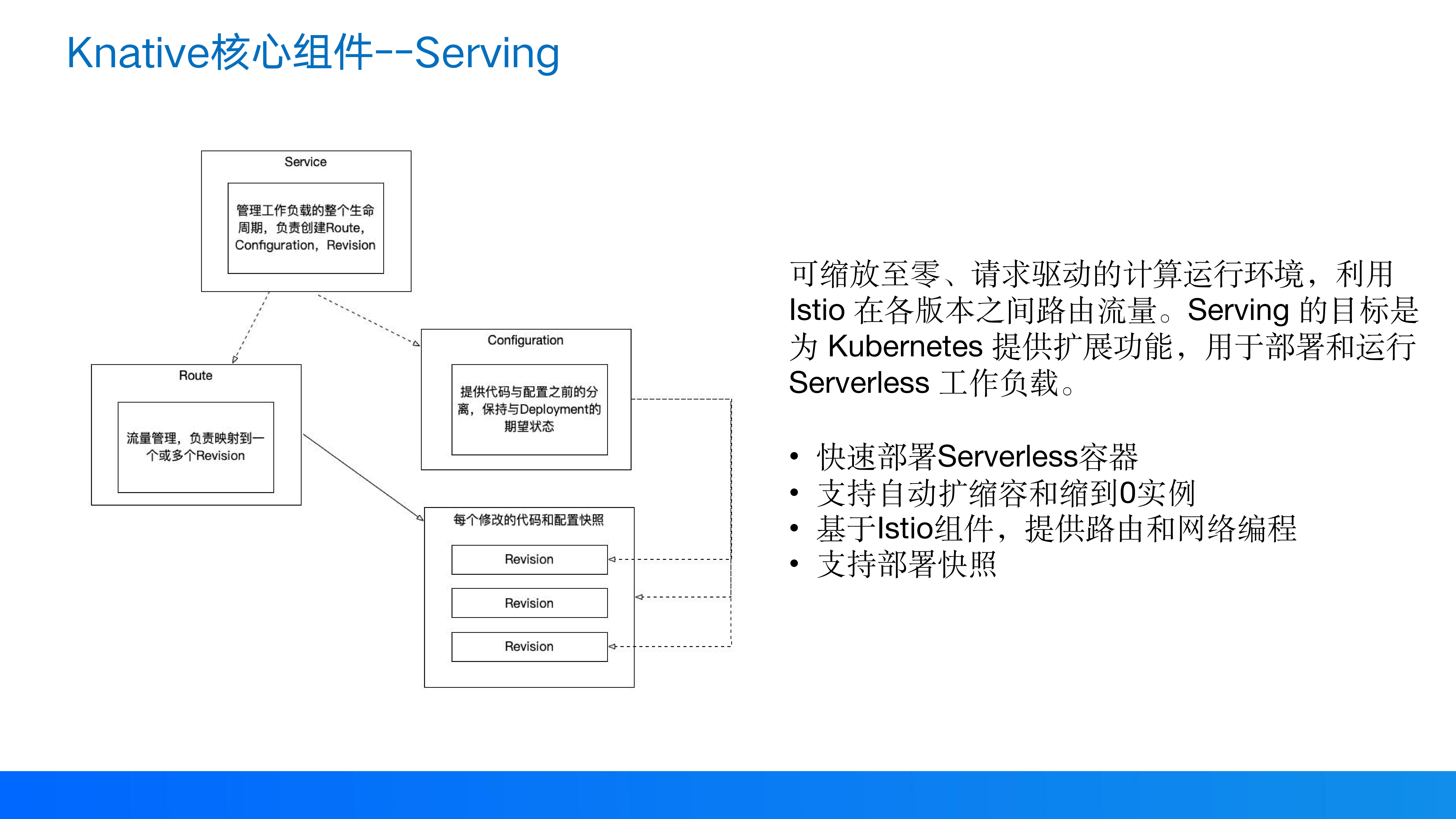 - Service: 自动管理工作负载整个生命周期。负责创建 Route、Configuration 以及 Revision 资源。通过 Service 可以指定路由流量使用最新的 Revision 还是固定的 Revision