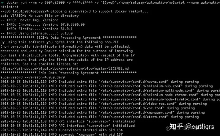 简单说明一下参数,5904是VNC需要用到的端口,可以通过本地VNC(127.0.0.1:5904)工具查看case运行效果。4444是selenium grid的映射端口。-v是把本地磁盘挂载到容器,方便代码调试, 因为采用$(pwd),表示当前路径,所以执行docker启动命令时候应该在自动化脚本所在位置。