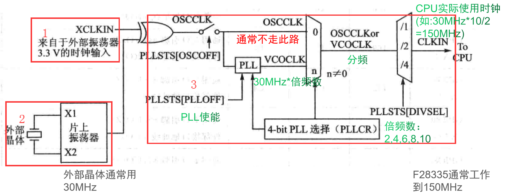图中用绿色文字标识出从外部晶振如何设置自己想要的CPU时钟频率 ,通常我们选用的外部晶振为30MHz,硬件连接如图中所示,通过PLL使能后先进行倍频,倍频的倍数值是由寄存器规定,不可用寄存器规定值之外的数组进行倍频,分频数值同理。这里的30MHz最多可以让CPU的时钟达到150MHz,具体过程为30MHz*10(倍频数)/2(分频数)=150MHz。