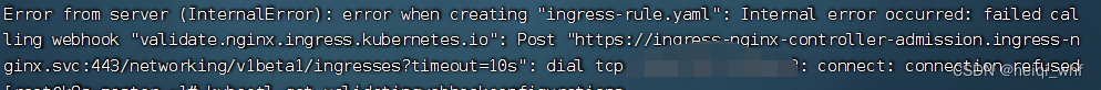 Error from server (InternalError): error when creating "ingress-rule.yaml": Internal error occurred: failed calling webhook "validate.nginx.ingress.kubernetes.io": Post "https://ingress-nginx-controller-admission.ingress-nginx.svc:443/networking/v1beta1/ingresses?timeout=10s": dial tcp ip:443: connect: connection refused