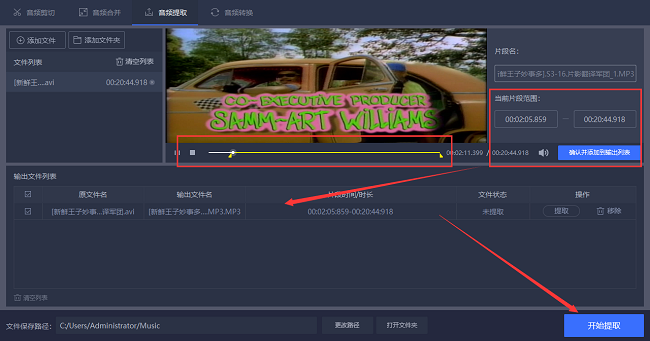 5、随后拖动导航栏选择我们需要提取的音频片段,然后点击“添加片段指针”按钮,最后我们点击确定,即可保存所选的音频片段。最后我们点击界面中的“开始提取”按钮即可开始提取我们的音频文件,随后耐心等待音频从视频中提取出来即可。
