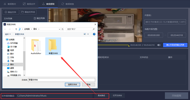 4、接下来我们就可以来进行输出了,我们可以设置文件的输出目录,点击文件夹就可以选择输出目录了。然后设置自己容易找到音频文件的位置,例如新建一个文件夹可能更有助于查找。
