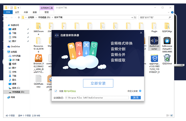1、这款软件很容易就能找到,在百度搜索“迅捷音频转换器”即可下载压缩包,解压之后双击安装包进行安装即可。