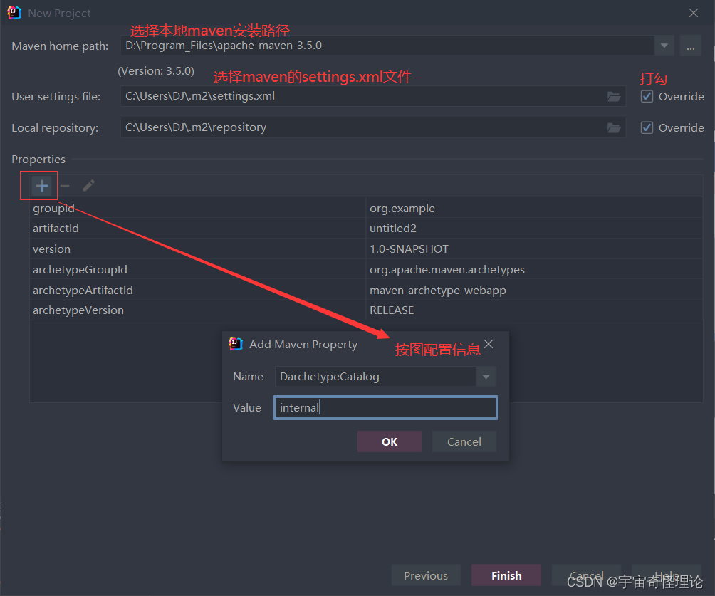 (4)、配置maven信息,并添加配置 DarchetypeCatalog=internal