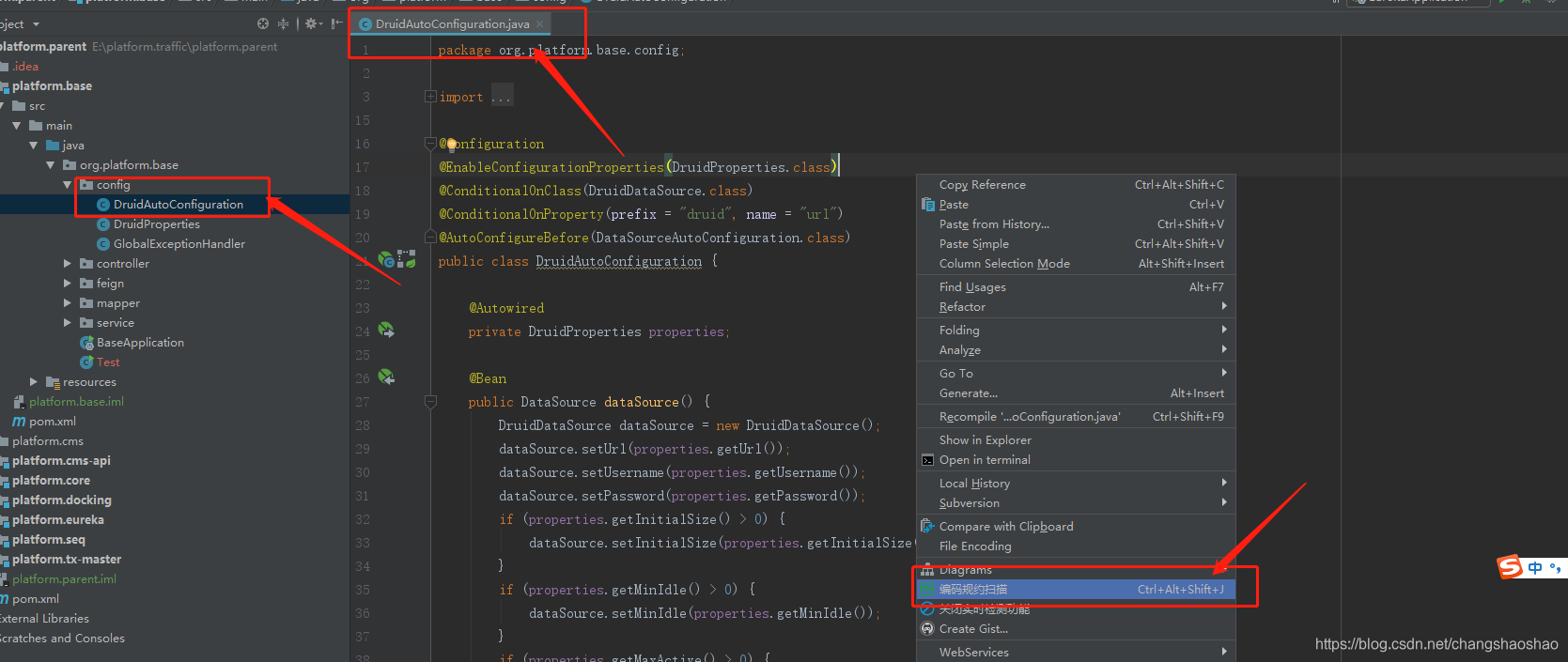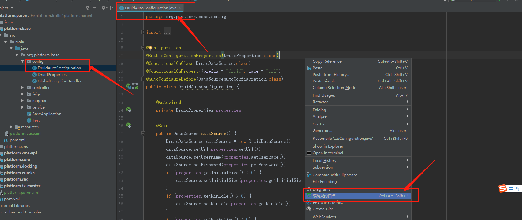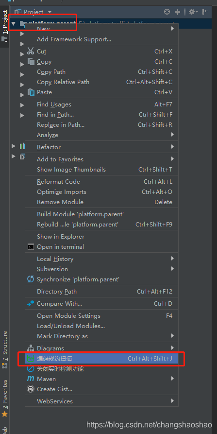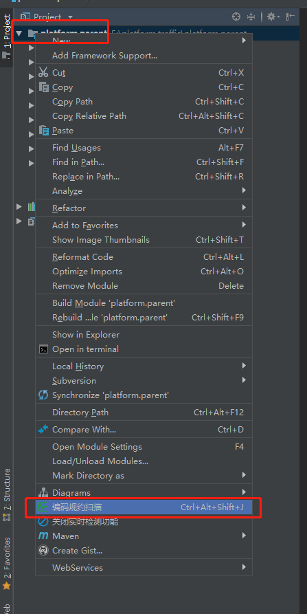 首先如果你想把老的项目统统检查一遍也可以对指定的类进行扫描,那么可以使用【编码规约扫描】,右键项目->编码规约扫描,如下: