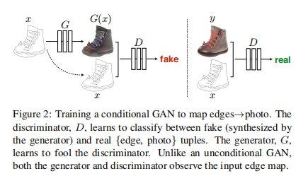 GANs是一个学习随机噪声向量z到输出图像y的映射的生成模型:G:z→y。相反的,条件GANs学习观察到的图像x和随机噪声向量z到y的映射:G:{x,z}→y。训练生成器G产生判别器D无法辨别真伪的图像,训练判别器D尽可能检测出生成器的“伪造”图像。