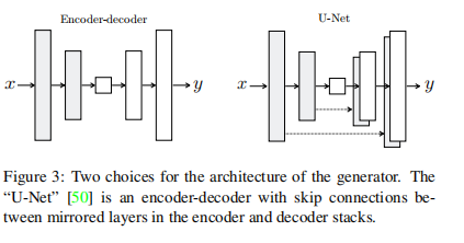 该领域许多早期工作使用了encoder-decoder network来解决这个问题。在这样的网络中,输入经过几层下采样,到达瓶颈层(bottleneck layer),然后逆转之前的过程。这种网络需要所有信息流通过所有的层结构。但是对于许多图像转换问题,在输入和输出之间存在很多可以共享的低级信息,在网络中直接传递这些信息可能会有所帮助。