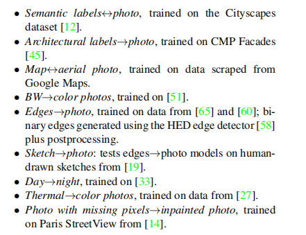 为了研究条件GANs的通用性,我们在各种任务和数据集上测试了该方法,包括图形学任务(比如相片生成)和视觉任务(比如语义分割):