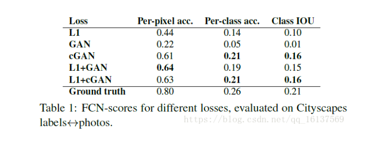 我们使用FCN分数来评价街景标签↔相片的任务(上表所示)。基于GAN的loss函数得到了更高的分数,这表明合成出来的图像包含更多可识别的结构。我们也测试了移除判别器上条件(标记为GAN)的影响。这种情况下。loss没有惩罚输入和输出中不匹配的地方,它只关心生成的图片是否真实,所以结果非常差。而且不论输入图片,生成器生成几乎一样的图片,在这项任务中这是非常不好的现象,明显cGAN表现比GAN优秀。然后L1 loss项也鼓励输出尊重输入,因为L1会对预测输出和真值输出之间的距离进行惩罚,所以L1加上GAN之后同样可以产生真实且尊重输入的结果,L1+cGAN得分和L1+GAN的情况差不多。