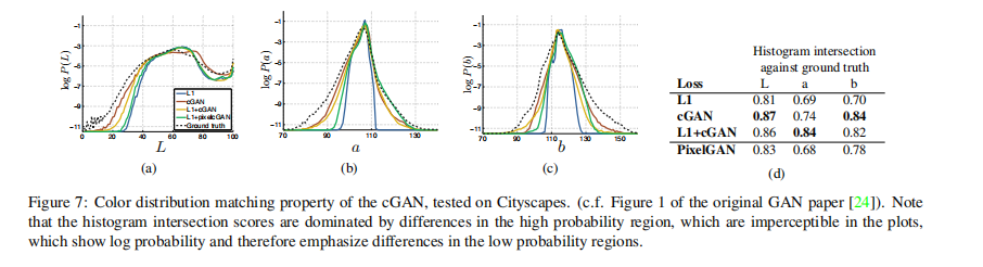 色度:cGAN一个显著的优点是甚至能够合成在标签输入中不存在空间结构,并且产生清晰的图像。我们猜想cGANs在光谱域内也有相似的效果,即使图像色彩更丰富。就像当无法确定边界的时候,L1 loss会造成模糊的结果,当像素点无法确定颜色的时候,L1 loss会促使生成平均、灰色调的颜色。特别的,L1将会通过选择各种可能颜色的条件概率中位数来使loss最小。另一方面,对抗loss大体上能够判断灰色的输出是不符合真实情况的,会鼓励生成符合真实颜色分布的色彩。在上图中我们研究了cGANs在Cityscapes数据集中达到的实际效果。曲线描述了在Lab空间中输出色彩的边缘分布。真实分布用点线表示。显然L1导致比真实情况更窄的分布,证明了L1鼓励平均,灰度化的颜色。另一方面,使用cGAN使输出的分布更加贴合真实分布。