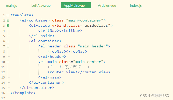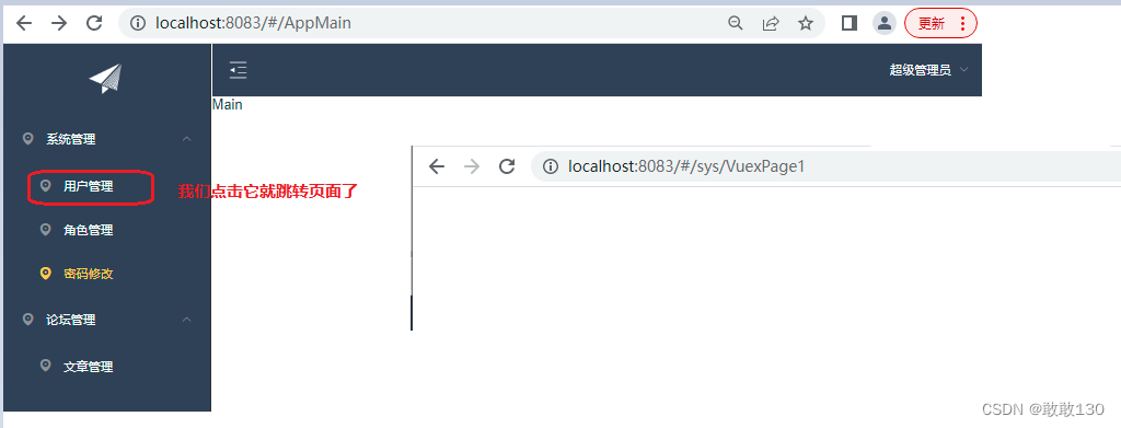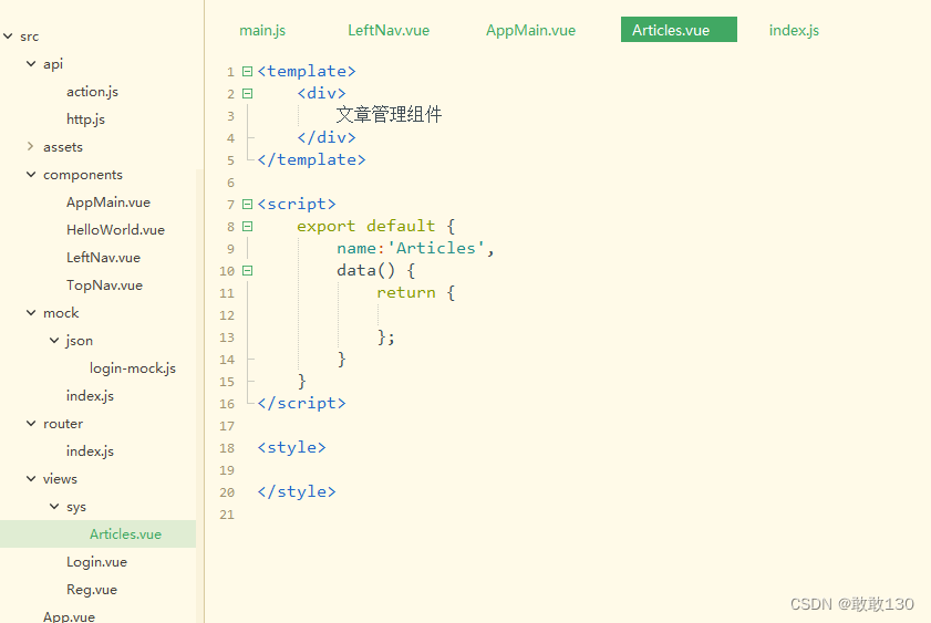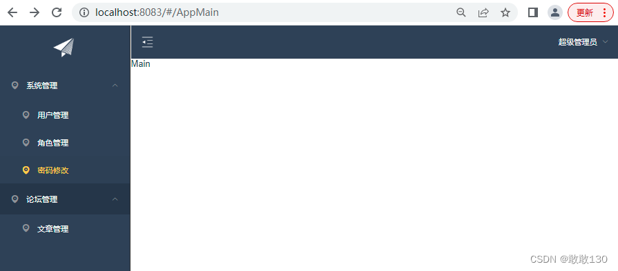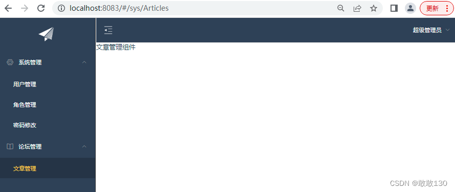 import Vue from 'vue' import Router from 'vue-router' // 3.定义路由与组件的对应关系 import HelloWorld from '@/components/HelloWorld' import AppMain from '@/components/AppMain' import LeftNav from '@/components/LeftNav' import TopNav from '@/components/TopNav' import Login from '@/views/Login' import Reg from '@/views/Reg' import Articles from '@/views/sys/Articles' Vue.use(Router) // 4.生成路由对象 export default new Router({ routes: [{ path: '/', // 这个可要可不用 name: 'Login', component: Login }, { path: '/Login', name: 'Login', component: Login }, { path: '/Reg', name: 'Reg', component: Reg }, { path: '/AppMain', name: 'AppMain', component: AppMain, children: [{ path: '/LeftNav', name: 'LeftNav', component: LeftNav }, { path: '/TopNav', name: 'TopNav', component: TopNav }, { path: '/sys/Articles', name: 'Articles', component: Articles } ] } ] })最终效果如图所示: