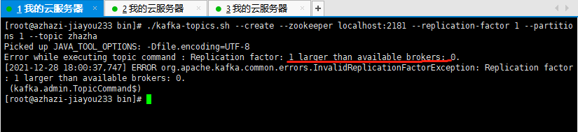 1.创建topic失败。kafka replication factor 1 larger than avaiable brokers 1