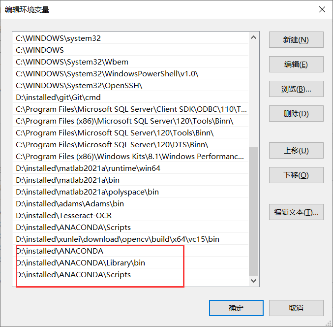 右键单击我的电脑——属性——高级系统设置——环境变量——系统变量选中path——编辑——新建。将着三个anconda的文件路径添加。