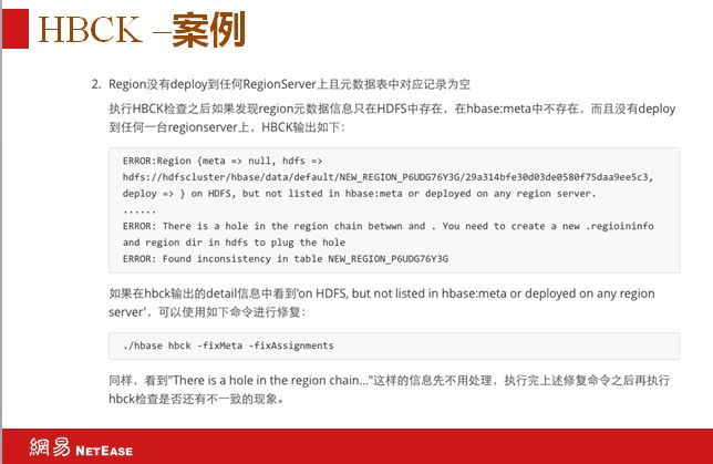 有时集群会出现region没有deploy到任何regionserver上,出现这种情况不要慌,90%只要执行./hbase hbck –fixAssignments就可以解决。如果实在解决不了,再去看打印的信息。第二种就是region没有deploy到任何regionserver上且元数据表中对应记录为空,如果在HBCK输出的detail中看到“on HDFS,but not listed in hbase :meta or deployed on region server”,可以用./hbase hbck –fixMeta –fixAssignments解决。同样看到“there is a hole in the region chain”这样的信息先不用处理,执行完上述修复命令再执行HBCK检查是否还有不一致现象。