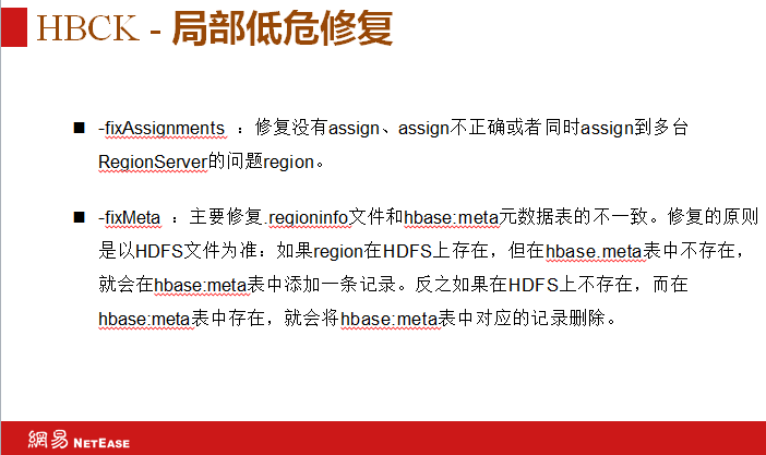 HBCK局部低危修复,80%问题都可以用-fixAssignments、-fixMeta修复。第一个主要修复没有assign、assign不正确或者同时assign到多台RegionServer的问题region。第二个是修复元数据,主要修复.regioninfo文件和hbase:meta元数据表的不一致。
