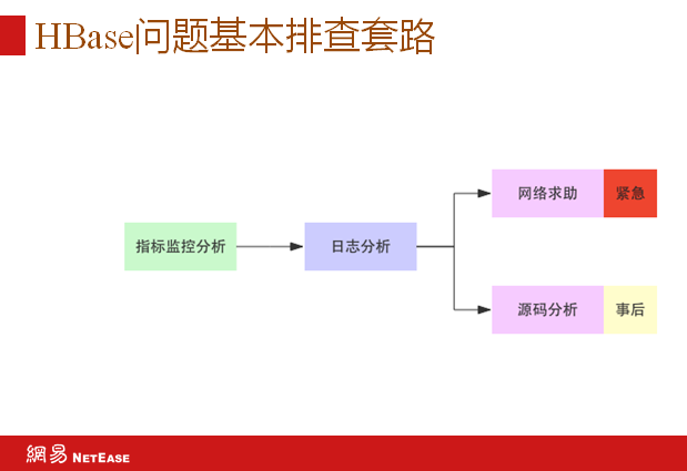 最后介绍下HBase问题排查思路,出现问题先做指标监控分析,再做日志分析,实在不行而且又很紧急的去网络求助,如果不是很紧急的一定要通过源码分析,最后建议一定要将问题从头到尾复盘一遍。
