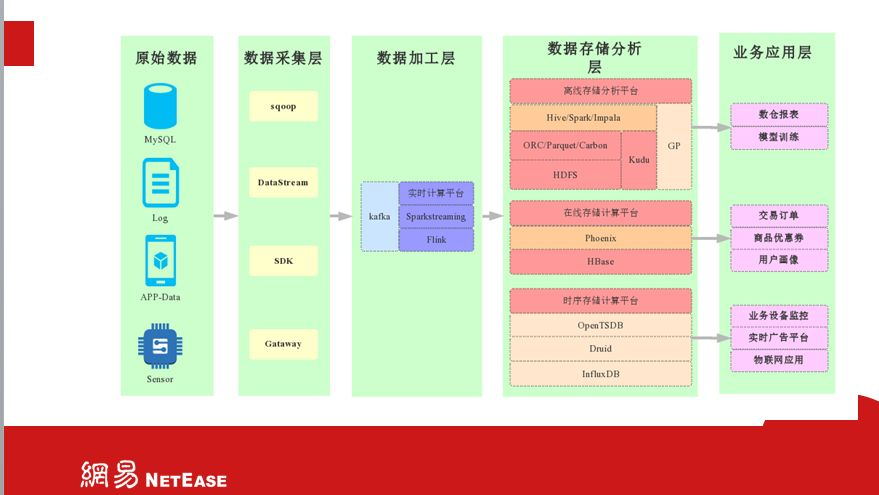 接下来介绍下网易大数据体系整个系统架构。数据来源方面,业务数据来源于MYSQL这类关系型数据库,还有一个重要来源是日志系统,另外还有外部APP或者web直接产生的一些打点数据,最后一个数据来源就是sensor,如工业设备监控产生的数据、CPU或者IO的一些指标数据。这些数据经过数据采集器进入数据存储,数据采集器比如sqoop、datastream(采集日志数据),还有APP的一些sdk。