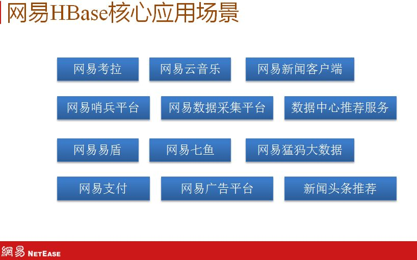 还有一些应用如电商订单,电商历史订单数据都是用HBase存储,内部消息系统历史信息也是存在HBase里面,云音乐的私信通知,以及网易新闻客户端APP Push通知都是存在HBase中。还有一些炫酷大屏,因为HBase延迟很小。货品上下架操作记录、搜索历史纪录、日志明细归档、cdn流量及带宽数据、信息安全用户轨迹等等。