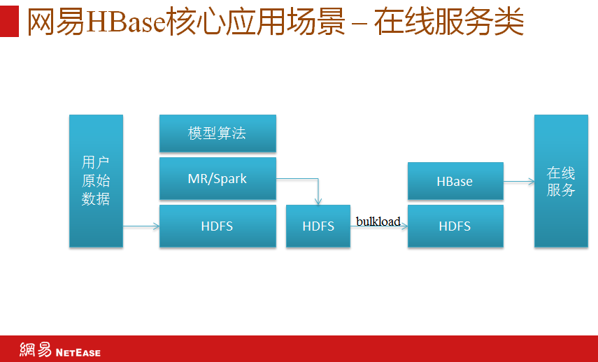 我们通常有很多用户原始数据,用户点击行为、浏览信息等数据搜集会将其流入HDFS中,在结合MR和spark做一些机器学习的工作,训练一些模型,这些模型数据通过bulkload导入HBase的HDFS中,然后通过HBase提供在线服务。这类业务有新闻推荐,比如通过客户端看一条新闻,接下来往下看系统就会推荐很多其他相关的新闻,这种数据需要实时产生。实现原理是Hadoop通过前期特征模型训练将数据放到HBase里面,用户再打开新闻客户端时模型就会实时推荐出你想要的其他一些新闻。