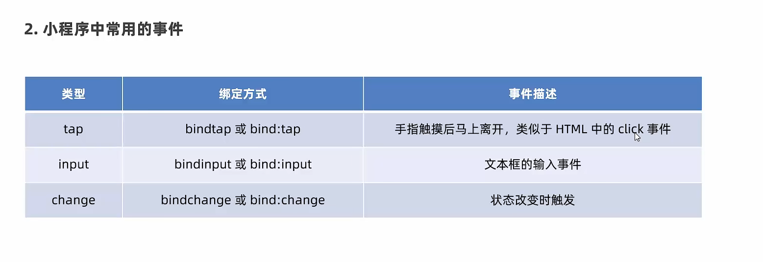 事件是渲染层到逻辑层的通讯方式,通过事件可以将用户在渲染层产生的行为,反馈到逻辑层进行业务的处理。