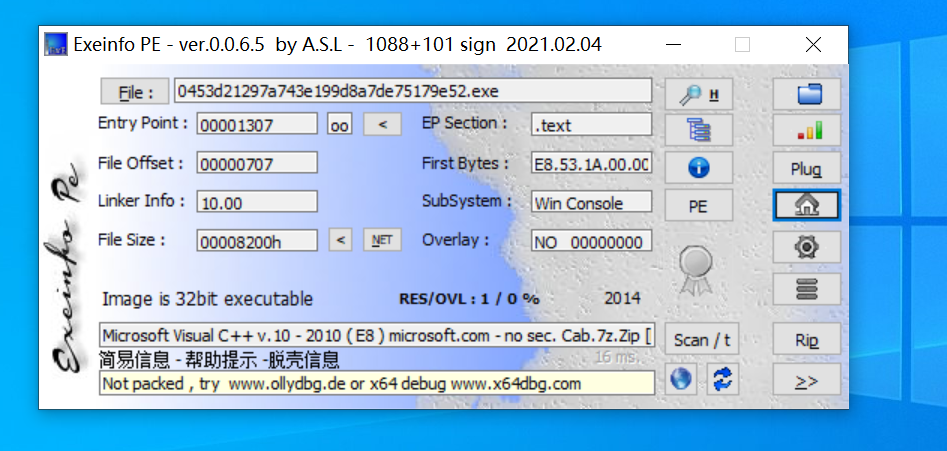 按照正常思路我们先用Exeinfo PE查看文件