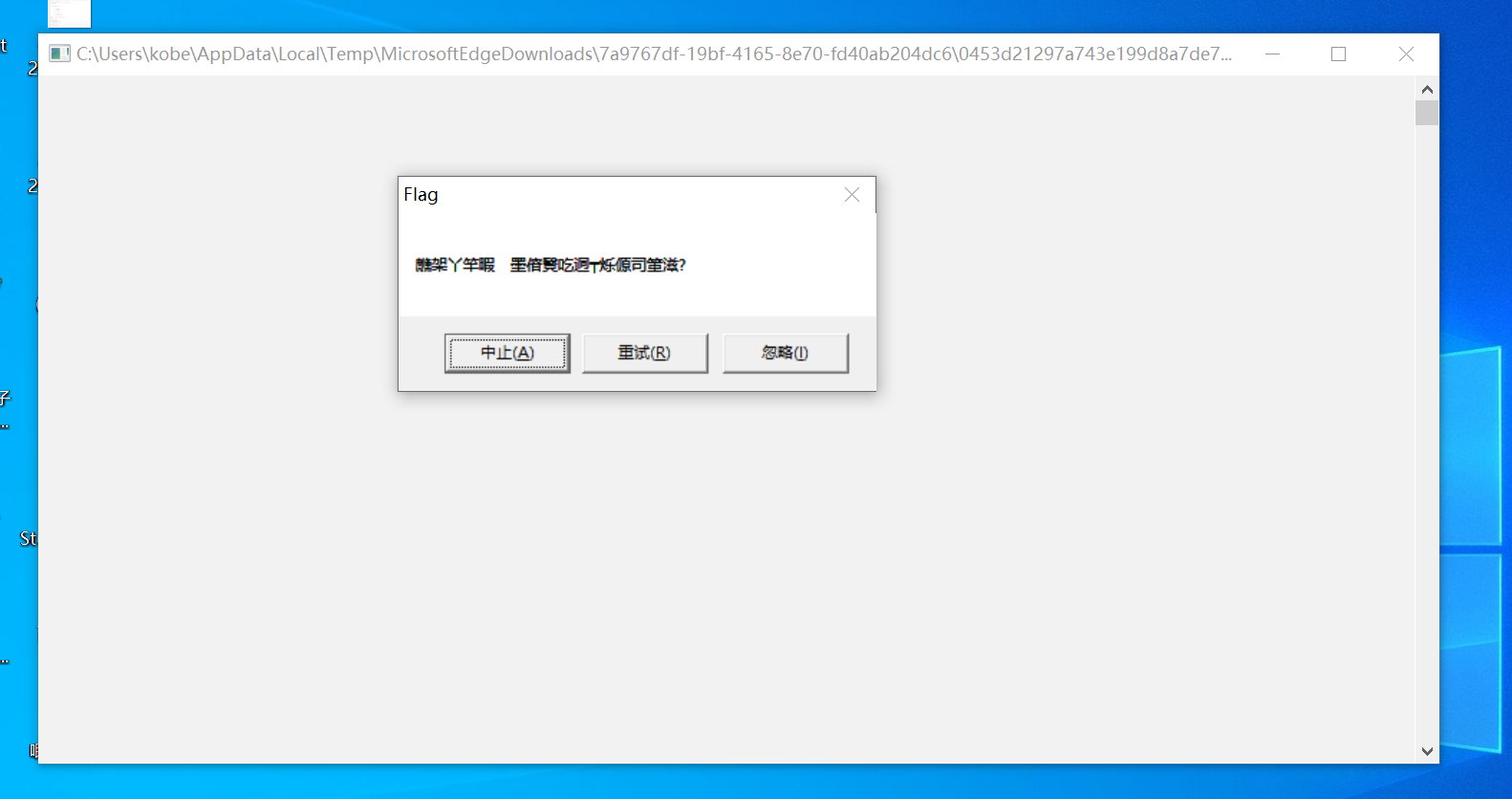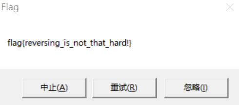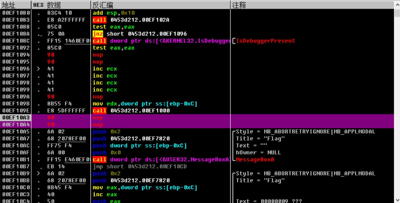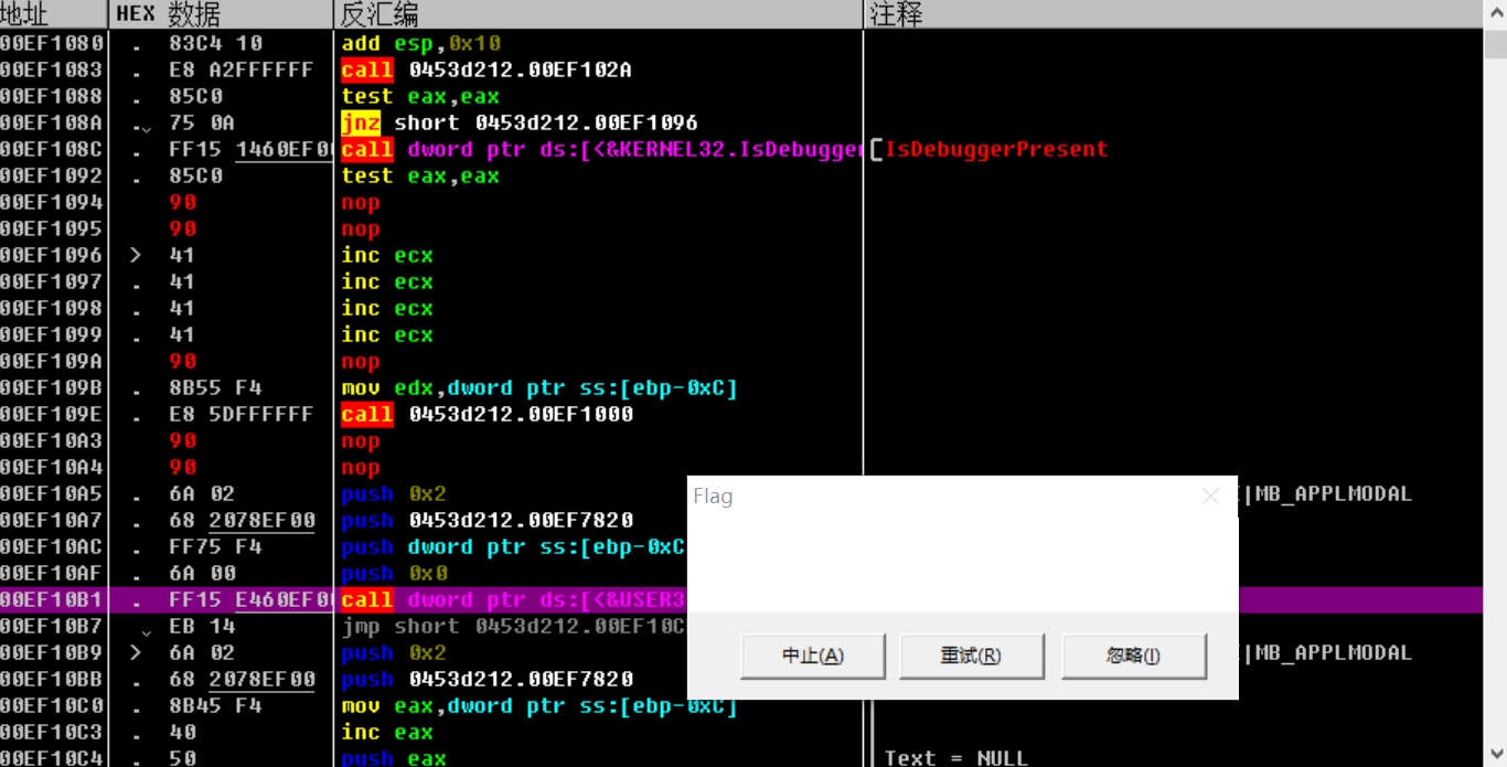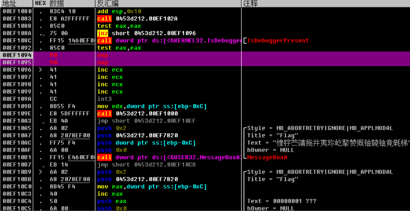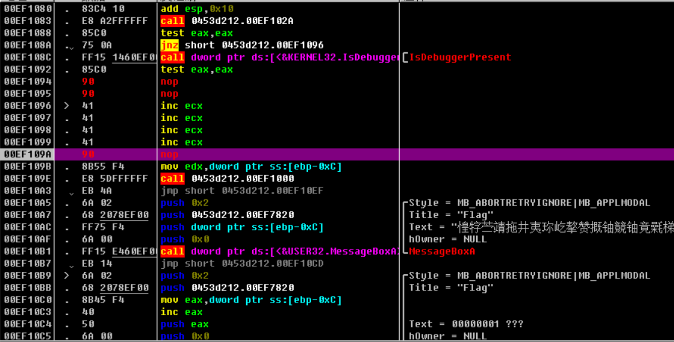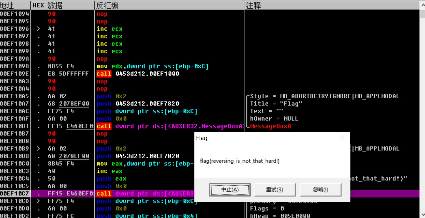 点击中止,发现又要执行一个跳转,跳过了我们真正的弹框函数,因此我们把这个跳转也给nop掉,接着F8,就可以看到flag了