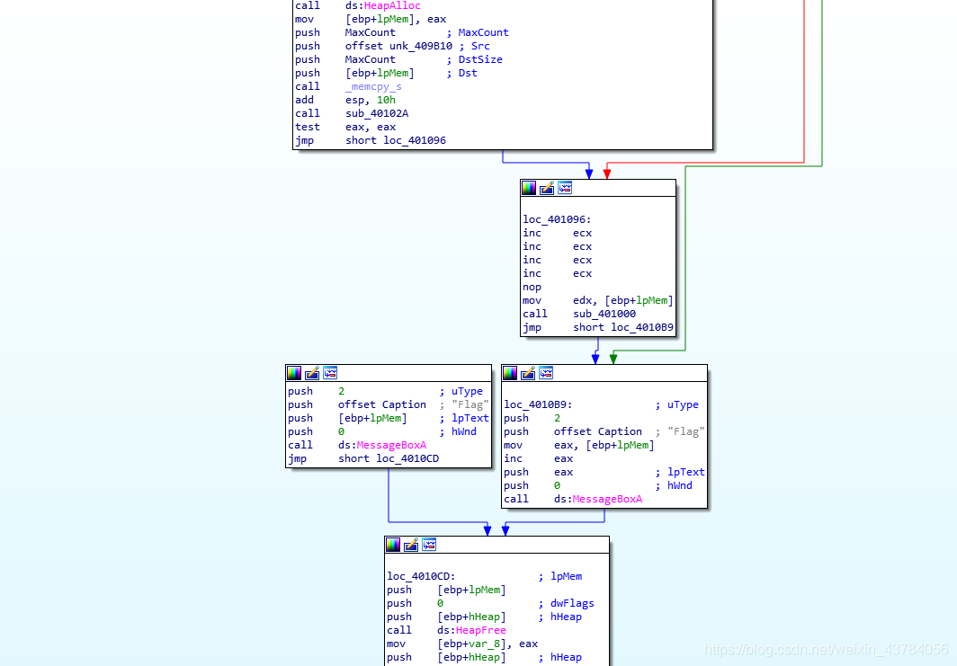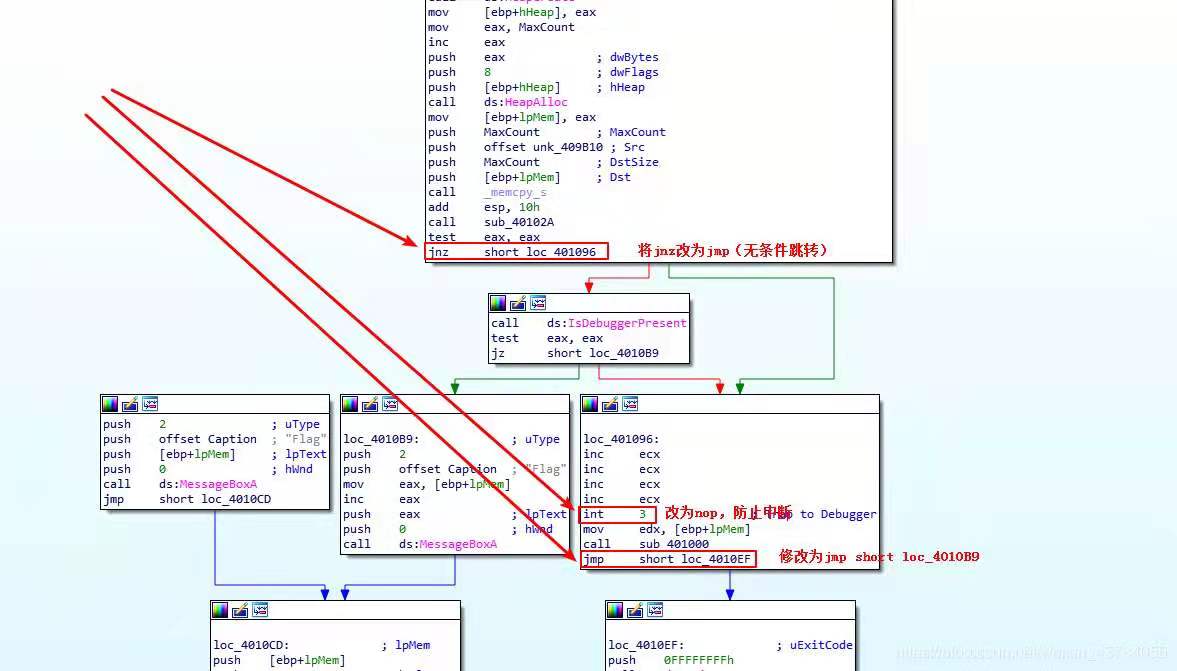 由于运行之后的是乱码,所以我们猜测生成flag的函数没有执行,因此我们应该把前边的中断函数给nop掉,并且后边退出程序的函数也不能执行,需要跳到弹框函数继续执行。