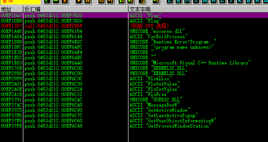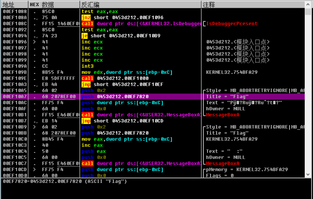 执行完一个MessageBoxA函数后,弹出一个什么也没有的框,其实这是另外一个弹框函数,真正输出flag的弹框函数是后面那个