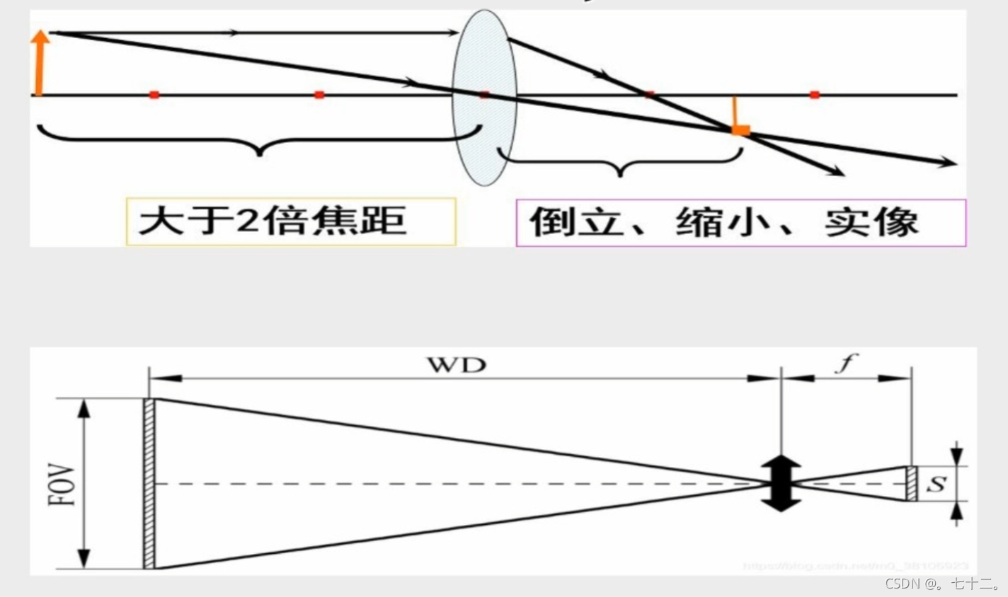 工业上一般使用的都是凸透镜。(工业上一般物距远大于相距,顾可以抽象为小孔成像原理)(像/视场=焦距f/物距w)